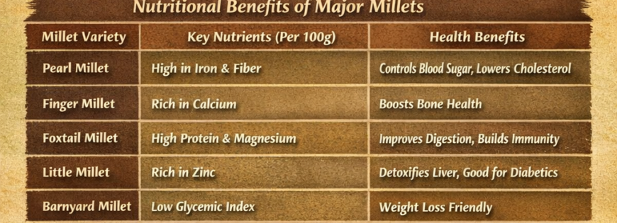 Nutritional Profile of Major Millets (Per 100g – Approx.)